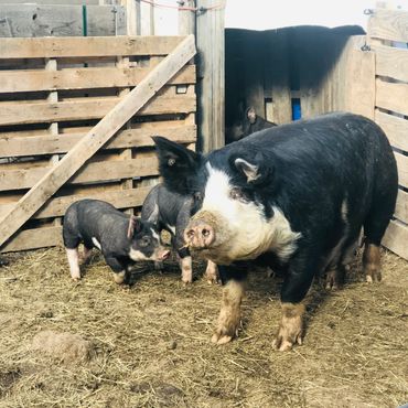 Tyler caught a pig at the Waterford, ME country fair our first year here in Maine! That pig, later named Bacon, was the first hog we added to our homestead.. As we started to learn more and more about pigs, we decided to raise Berkshire Hogs as they are a hearty Heritage Breed known for their delicious meat, good mothering skills and excellent disposition.